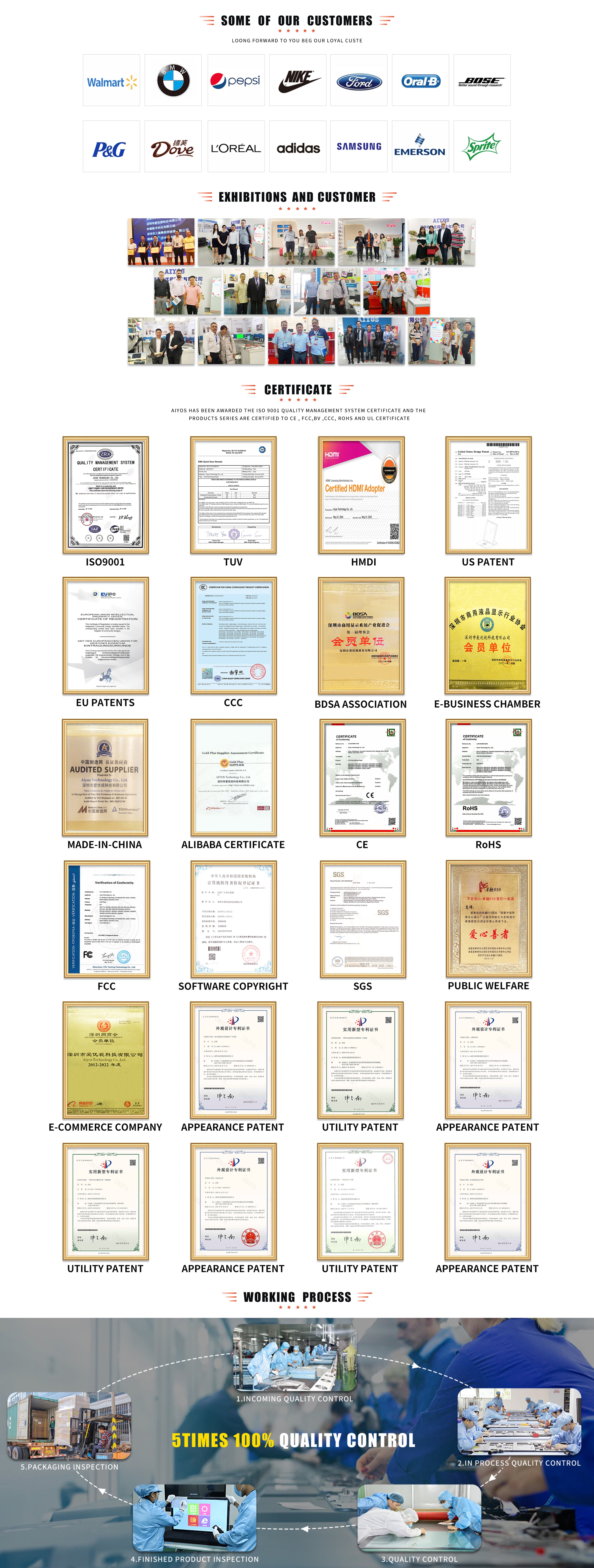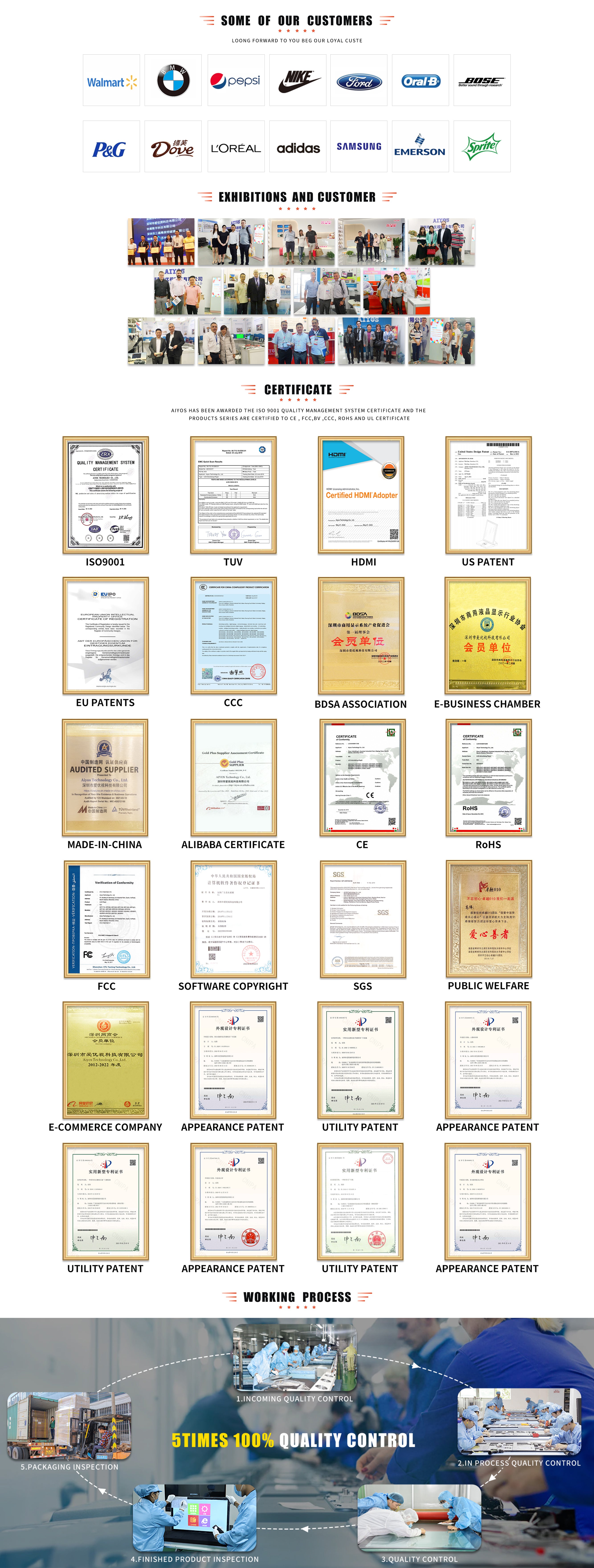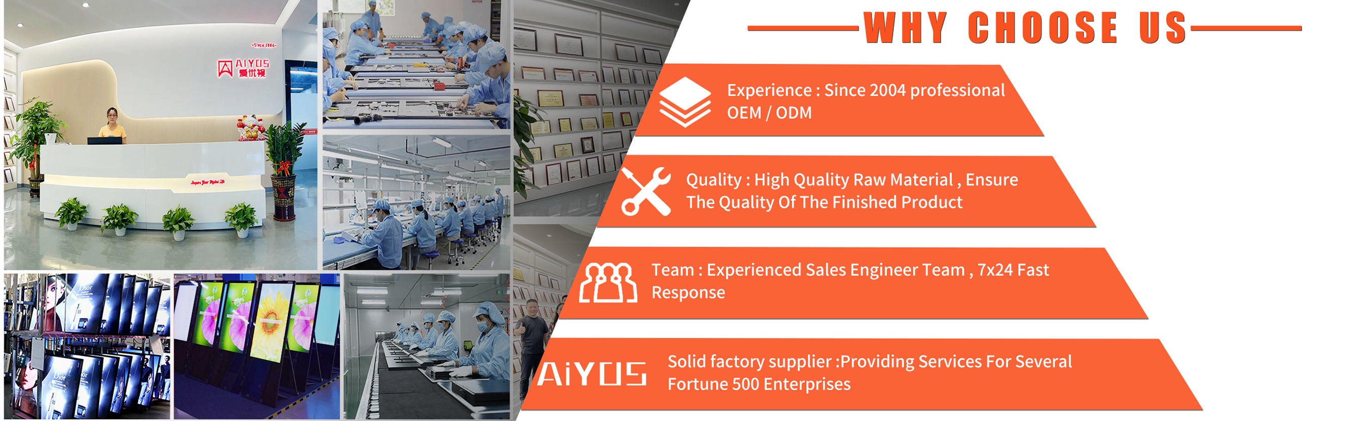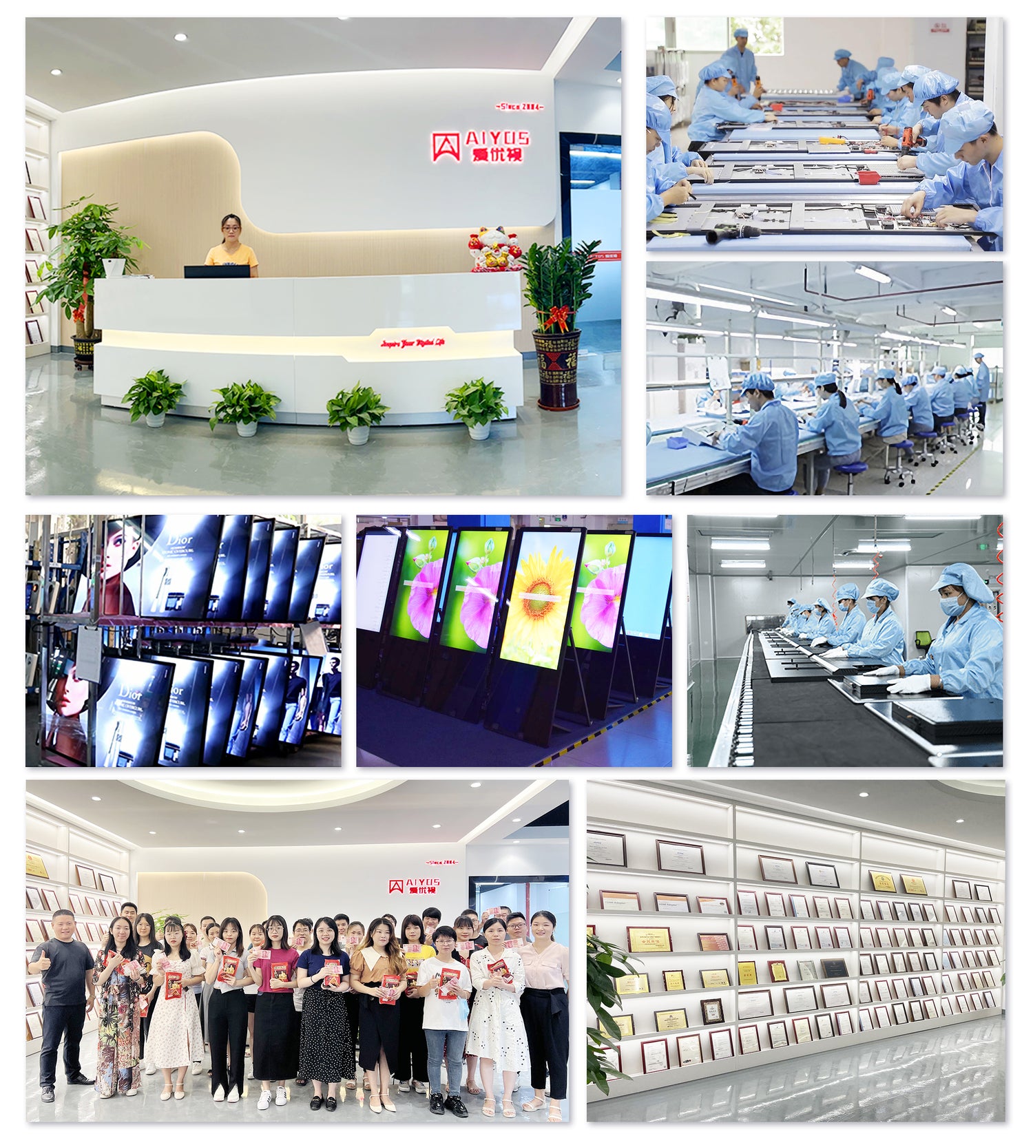 AIYOS Technology is a professional factory located in Shenzhen , which has been specialized in LCD advertising displays for more than 21 years . our main products are : digital photo frame , digital signage , all in one tablet , floor stand kiosk , also customized displays with paper / plastic / acrylic / metal cover , In past 21 years , we provided innovative , easy ,green digital signage solutions which used as digital menu boards , directions , advertising , retail promotions etc .We have provided LCD display solutions for more than 3500 customers from all over the world , like USA , UK , Germany , Spain , Netherlands , Switzerland and so on Customers trust .